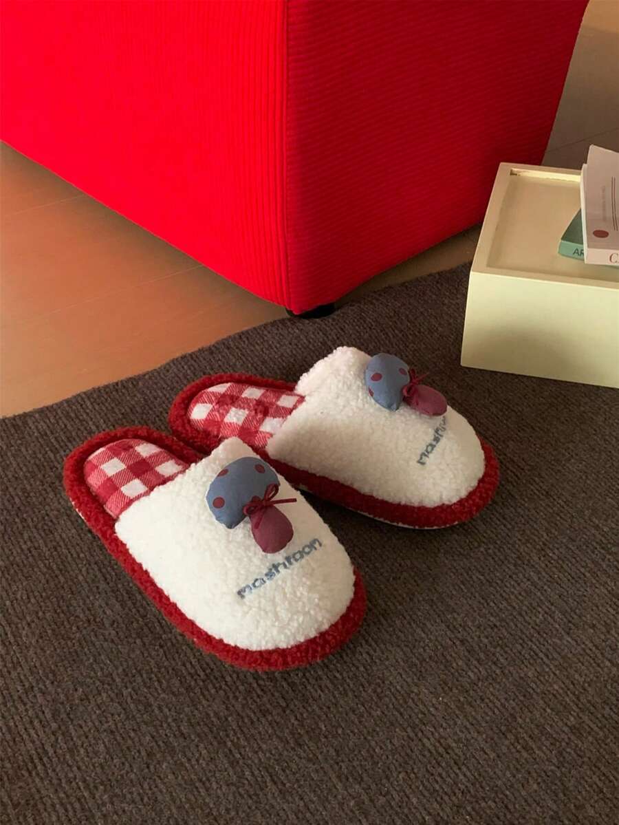 XIXITIAO زوج من الشبشب المسطح ذو لون متباين على شكل فطر للنساء، قاع ناعم وفراشي للأحذية المنزلية، تصميم جميل، دافئ وهادئ لأرضية الحذاء للشتاء، أنيق وخفيف الوزن مغلق الأصبع