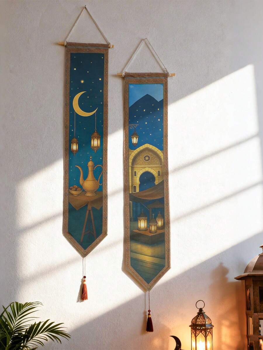 1/2 قطعة من الجداريات البوهيمية بنقش القمر والنجوم، جداري جدار أنيق بتصميم فانوس الشرانق، ديكور للأعياد والحفلات، جداري فني مستطيل طويل بتصميم إبريق الشاي القديم، سهل التعليق والعرض، ديكور منزلي، مناسب كهدية لأصدقاء وعائلة - يمكن استخدامه في الحمام أو غرفة المعيشة أو غرفة النوم أو منطقة الصلاة