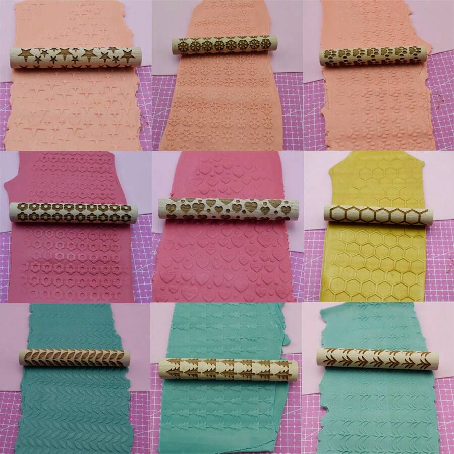 لف خشبي بطول 10 سم للطين البوليمري DIY، للنقش والنسج على الخزف والسيراميك بنقوش أشكال الأزهار والأوراق والشمس والقلب والموج والقشرة الخشبية والنجمة