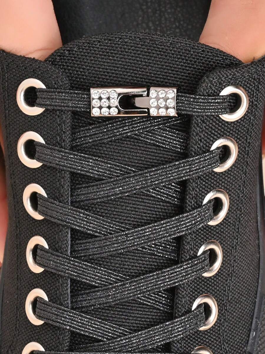 زوج من أربطة الأحذية المطاطية المرنة بإبزيم مرصع بالراين ذات لون أسود مطفي، مناسبة للأحذية الرياضية والكاجوال والأحذية البيضاء وأحذية كرة السلة والأحذية الرياضية، فكرة هدية إكسسوارات الأحذية
