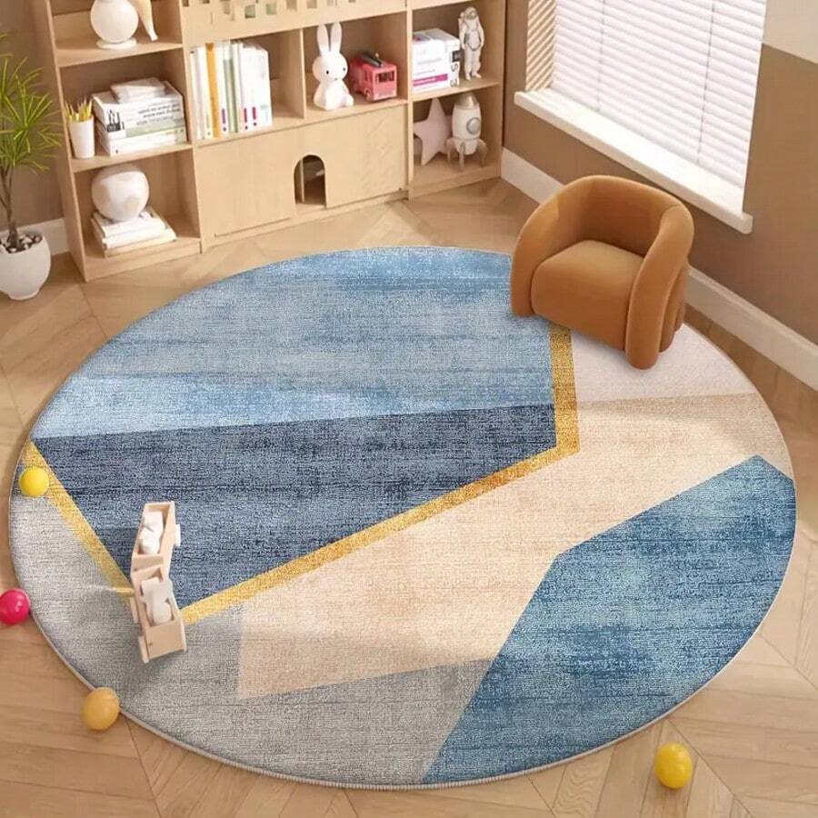 سجادة دائرية بنمط بوهيمي مع خطوط مجردة ملونة وأنماط زهرية صغيرة، ديكور مبسط على الطراز المتوسطي، مناسبة للمكتب أو قاعة المعارض