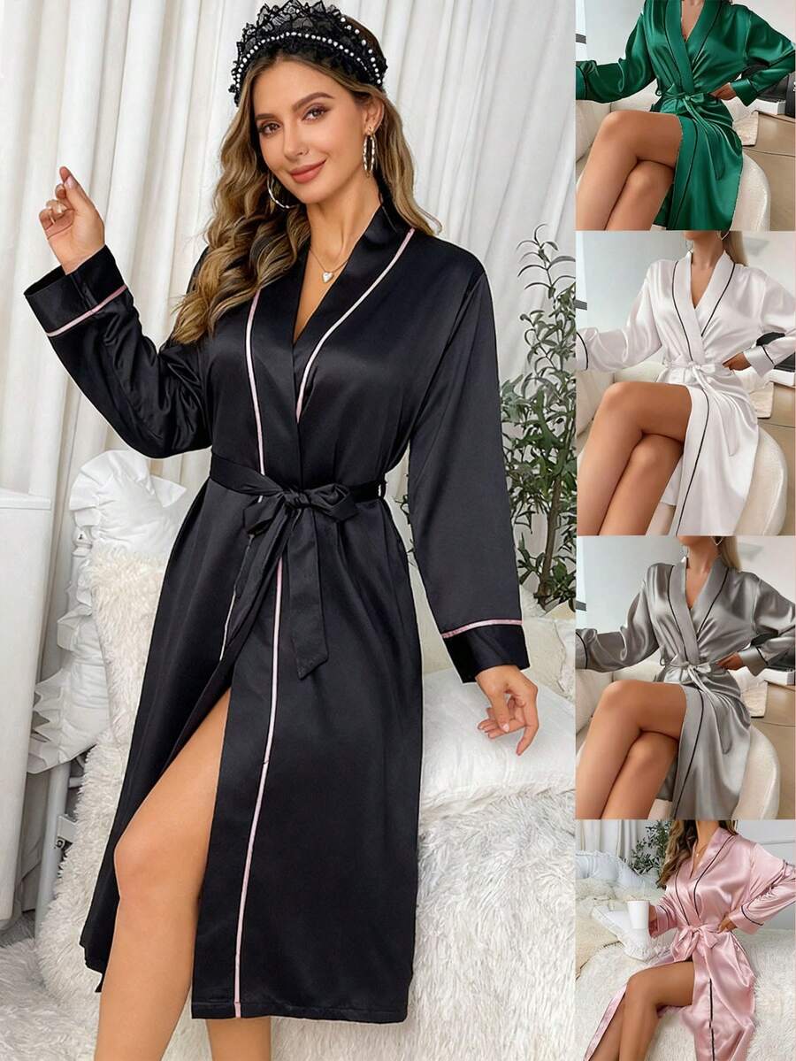 1 قطعة رداء أنيق بربطة الخصر للنساء، فستان نوم قصير من الساتان الحريري الناعم، لون أحادي أنيق بربطة الخصر خفيف الوزن، قصير وحريري ناعم، مناسب للعرائس والوصيفات والاستخدام المنزلي. فستان قصير لموسم الزفاف، رداء بطباعة حرفية، كيمونو ولباس نوم.