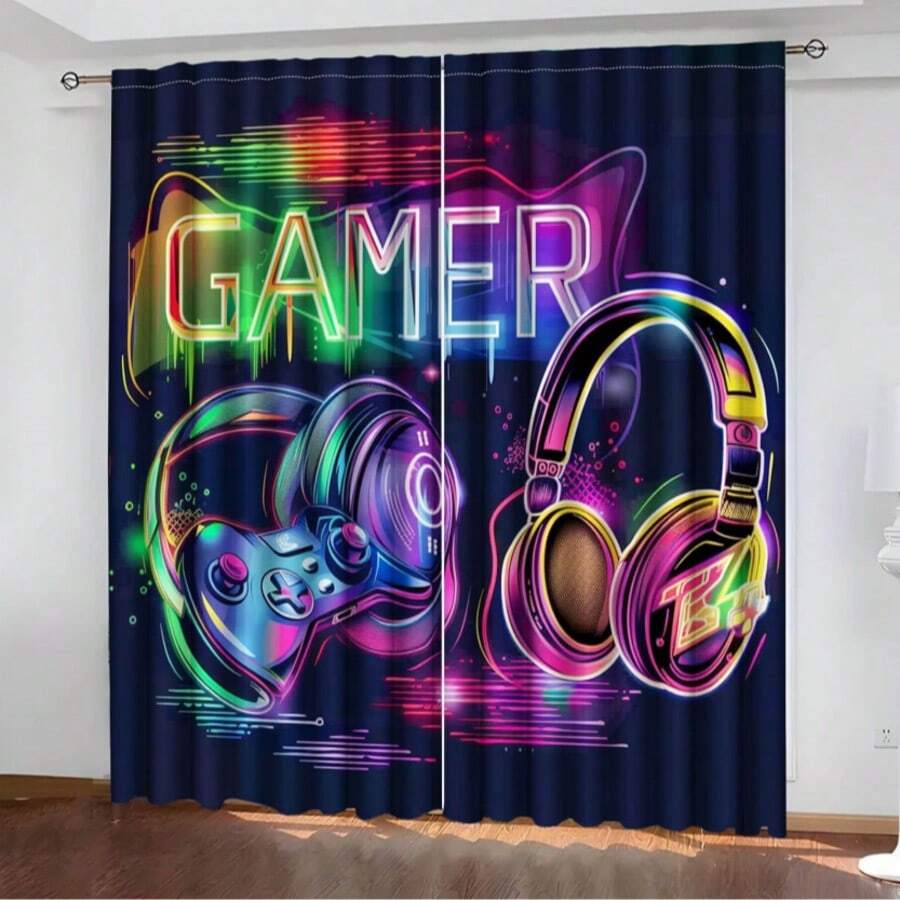 ستارتان بموضوع ألعاب الفيديو، تتميز بطبعات بارزة لسماعات الرأس وأجهزة التحكم - بأسلوب فني حديث، توفر الخصوصية، مناسبة لغرفة النوم والمعيشة والمكتب أو السكن الجامعي - من قماش البوليستر، قابلة للغسل في الغسالة، ديكور غرفة الألعاب
