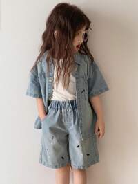 في غسيل متوسط ملابس جينز من قطعتين للفتيات الصغيرات
