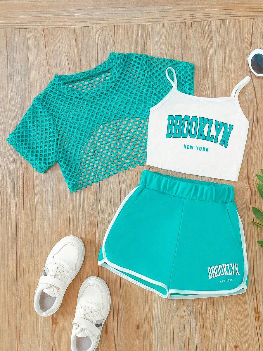 3 قطع طقم بنات مراهقات يتكون من ملابس علوية كامي مطبوع عليه حرف بروكلين + ملابس علوية شبكية + شورت، طقم موضة صيفية للخارج، مناسب للاستخدام الخارجي والهدايا الصيفية