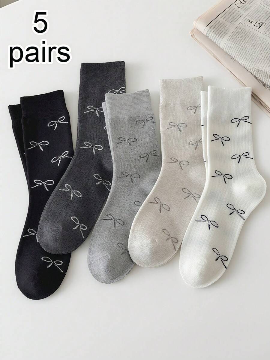 5 أزواج (شحن عشوائي) جوارب نسائية عصرية ، جوارب متوسطة الساق مع زخرفة فيونكة رقيقة ، متعدد الاستخدامات لجميع المواسم