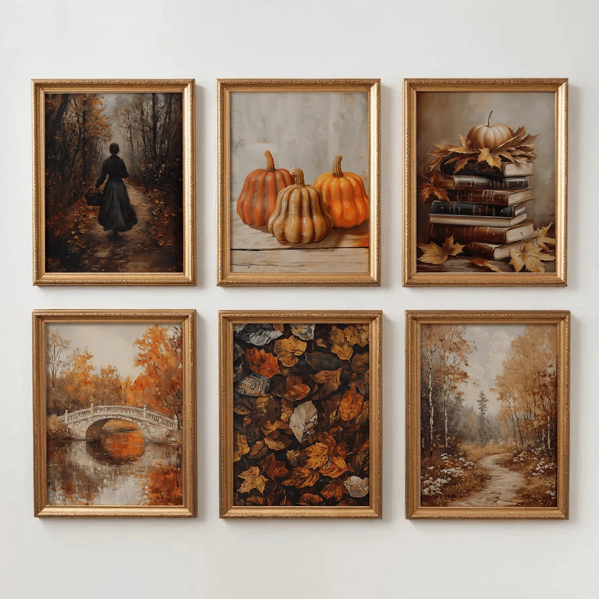 6 قطعة/مجموعة مطبوعات فنية خريفية قديمة | مجموعة من 6 مطبوعات خريفية | فن الحائط الخريفي | ديكور خريفي بألوان دافئة | مجموعة طباعة لعيد الشكر الموسمي | امرأة تسير في الغابة ، اليقطين ، كومة الكتب ، الجسر ، أوراق الخريف ، ممر الغابة | مؤطرة أو غير مؤطرة ، ديكور الغرفة ، ديكور المنزل ، ديكور بيت الطالب ، هدايا لزينة الحائط في الفندق ، المنزل ، غرفة المعيشة ، غرفة النوم ، الحمام والمكتب