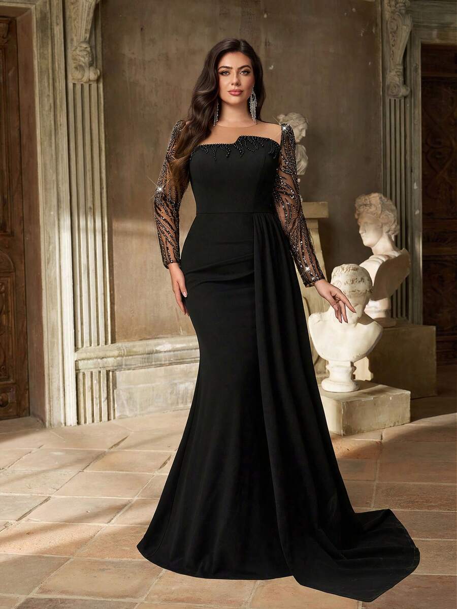 Aureia فستان أنيق بأكمام طويلة وياقة مستديرة، مزين بترتر على الصدر، من قماش شفاف ولمسات ترتر فاخرة، تصميم ذيل سمكة، مناسب للاحتفالات والحفلات والمناسبات الرسمية وعشاء الجالا