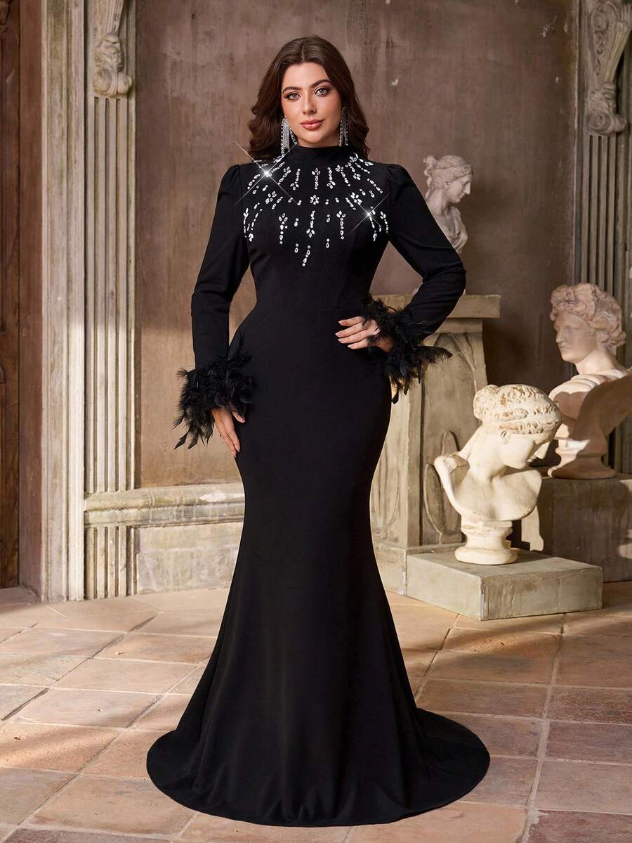 Aureia فستان أنيق طويل الأكمام بياقة عالية مزين بالريش والخرز اليدوي، مناسب للزفاف والحفلات والمناسبات، فستان سهرة مطرز بشكل مكثف (ريش الرومي)