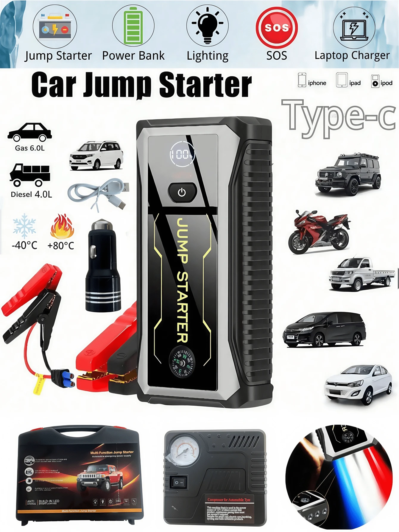 بادئ تشغيل السيارة، شاحن بطارية السيارة، بنك طاقة بادئ التشغيل (يصل إلى 10 لتر بنزين أو 8.5 لتر) مع شاحن محمول، ضوء طوارئ LED، مطرقة، بوصلة