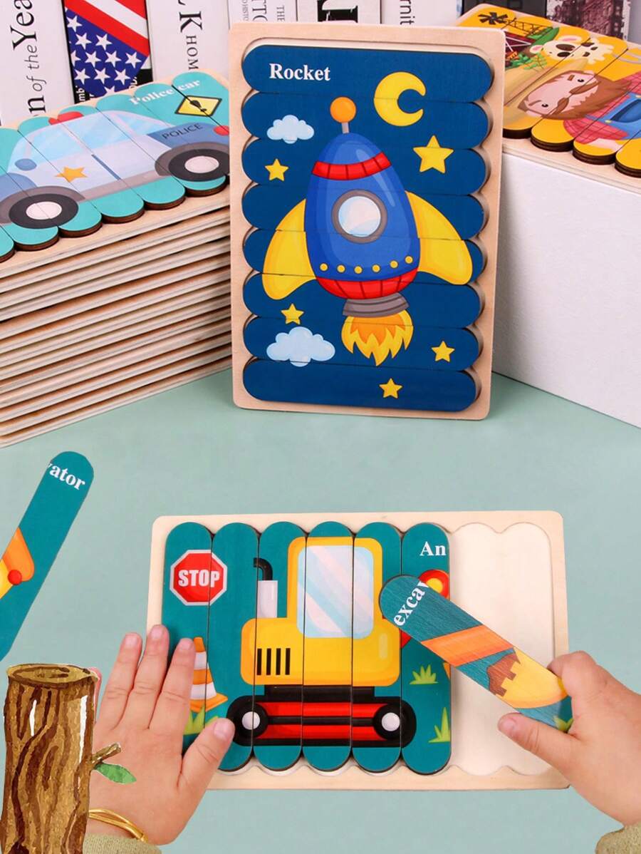 لوح ألغاز خشبي ثنائي الوجه - موضوعات الحيوانات والنقل، تصميم مثير للأحاجي ، لعبة تعليمية للأطفال