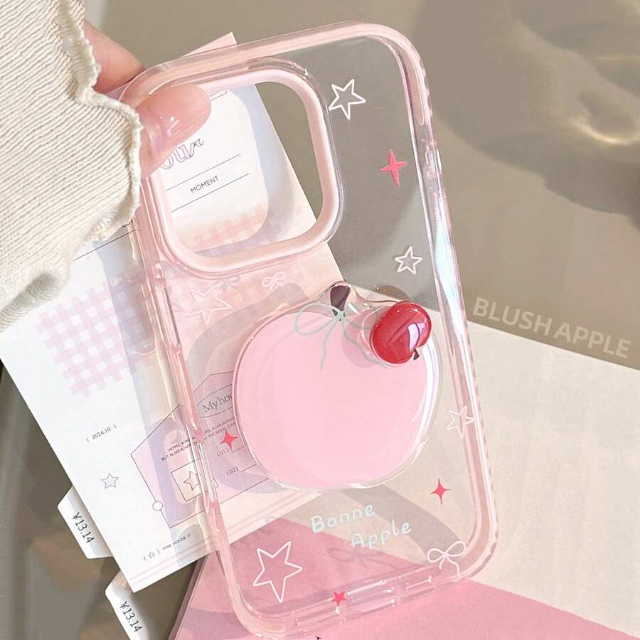 حافظة هاتف بشكل تفاحة ثلاثية الأبعاد دوارة باللون الوردي متوافقة مع هاتف آيفون 16 برو ماكس، حافظة سيليكون ناعمة وشفافة بتصميم بسيط وجميل متوافقة مع هواتف آيفون 14 و 13 و 11