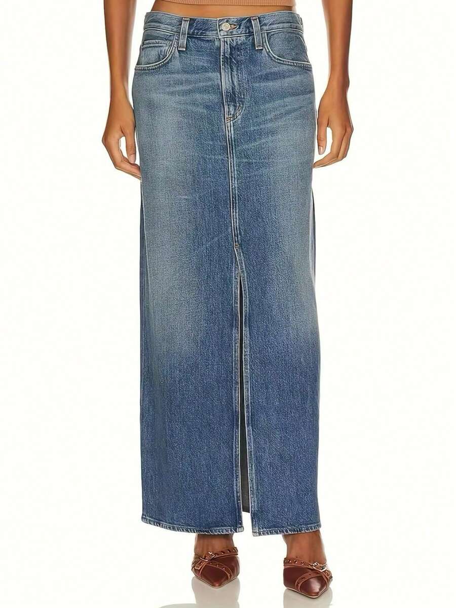 تنورة جينز متوسطة الطول ذات تصميم ممشق مع شق من النمط A-line وخصر عالٍ، موضة جديدة ربيع 2025 للملابس الرسمية والكاجوال متعددة الاستخدامات