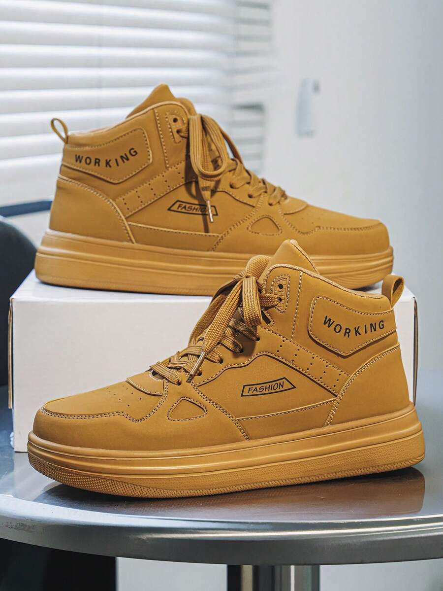 أحذية رياضية كاجوال عالية الكعب للرجال بتصميم أحادي اللون بلون الخردل مع رقعة حرفية أمامية مربوطة، أحذية رياضية مريحة وعملية للاستخدام اليومي للمراهقين