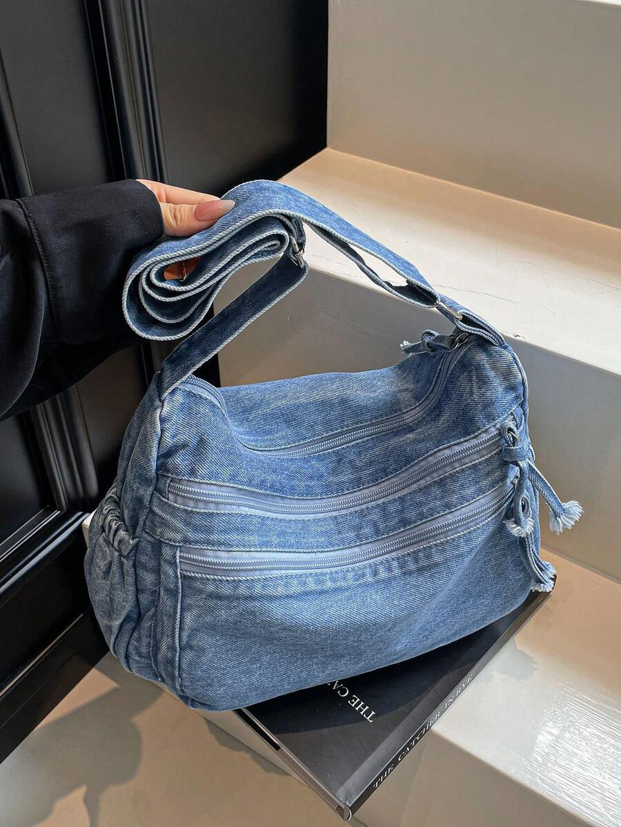 حقيبة كروس بودي كاجوال شيك ناعمة من الجينز متعددة الطبقات مع جيوب متعددة، حقيبة كتف نسائية كبيرة السعة متعددة الاستخدامات مناسبة للذهاب للعمل والتسوق والسفر