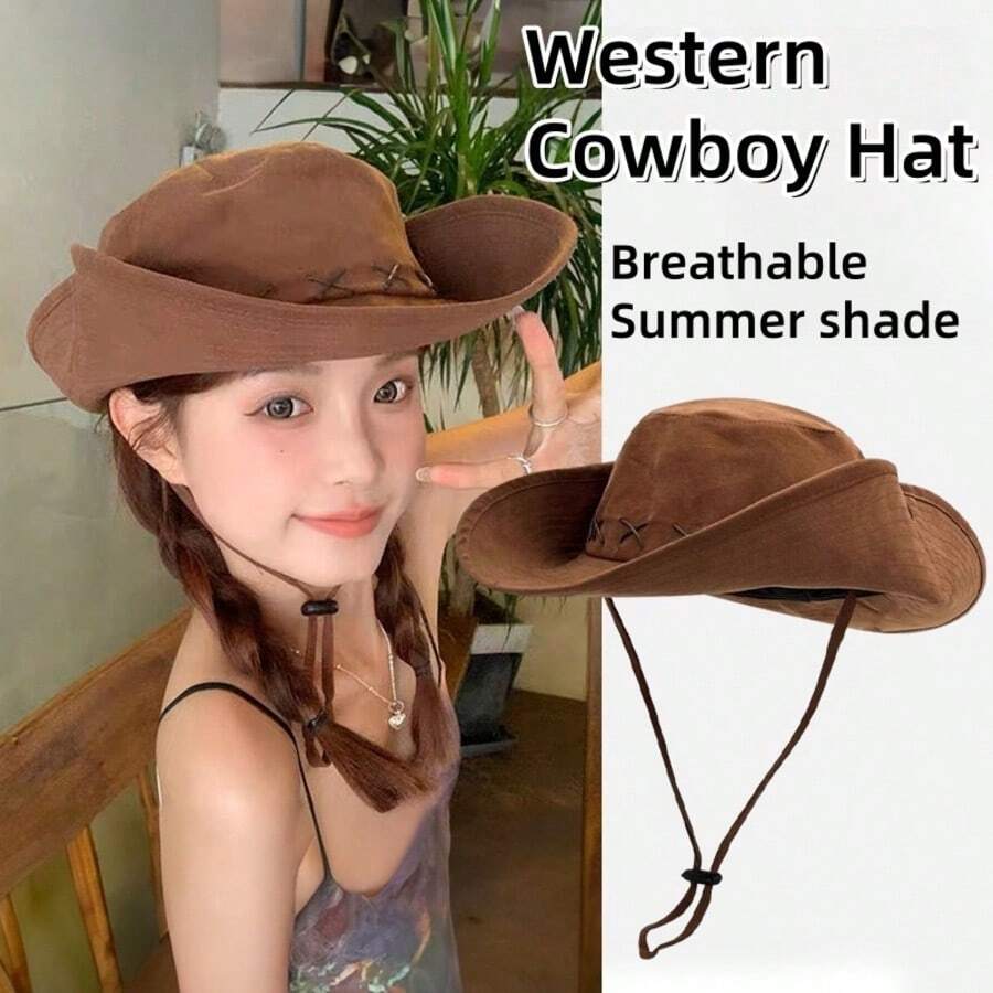 قبعة شمس صيفية قابلة للتنفس بطراز رجعي، قبعة حفلات، قبعة كاوبوي غربية بحماية من الأشعة فوق البنفسجية - ذات حافة واسعة، خيط قابل للتعديل، خفيفة الوزن ومرنة، مناسبة للتنزه والشاطئ والأنشطة الخارجية، قبعة شاطئ للحفلات