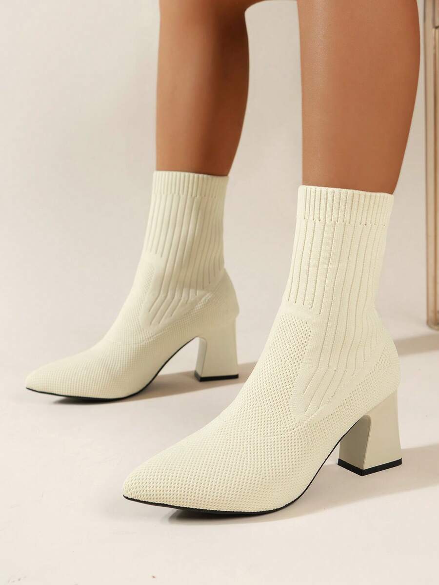بوت أنيق كاحلي نسائي ذو كعب عالي بلون البيج مصنوع من الصوف المحبك، ذو تصميم أنيق وأناقة فريدة مناسب للموضع العمل، مرن وممتد بحجم كبير