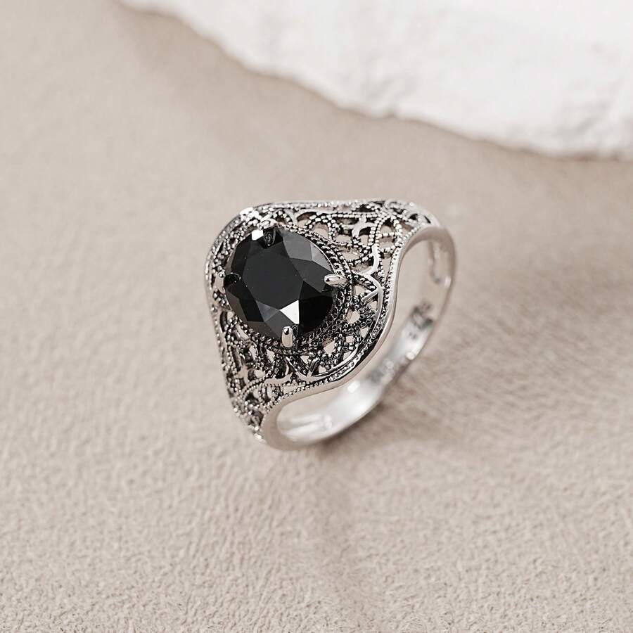 خاتم حجر كريم أسود محفور بطراز بوهيمي قديم، مجوهرات فضية متآكلة، تصميم فريد مخصص