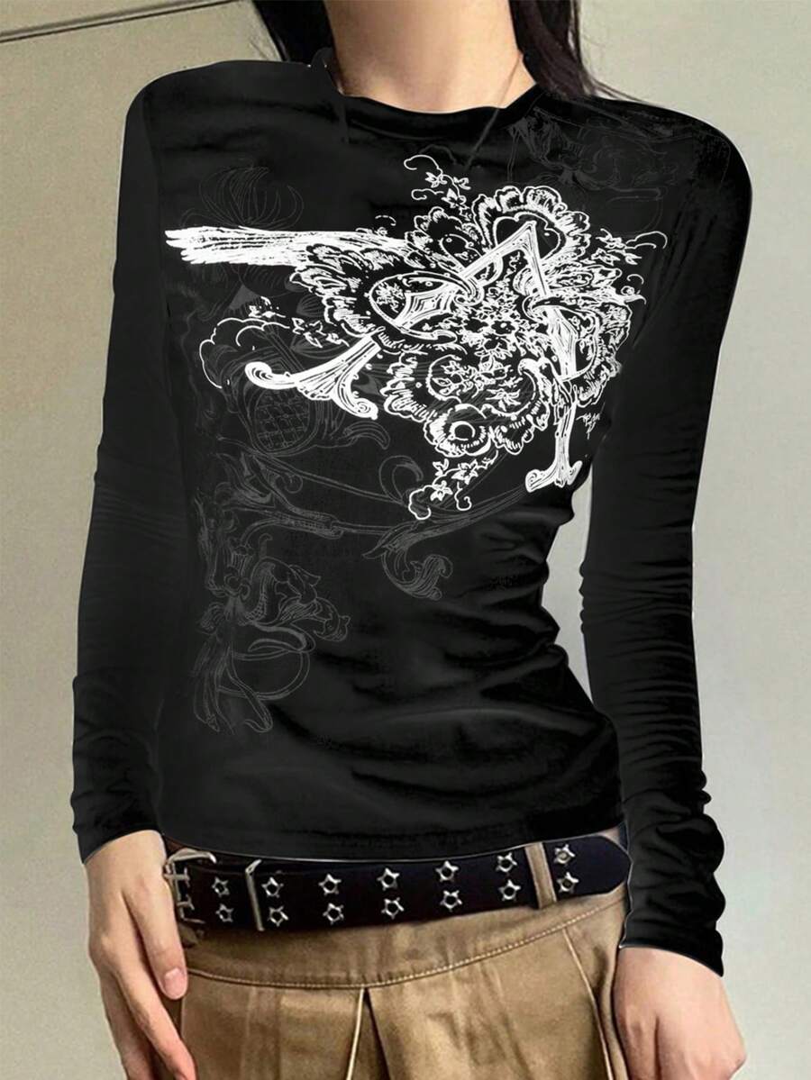 تي شيرت تيشيرت أكمام طويلة بياقة طاقم لنساء، طراز كاجوال ملائم، لون أحادي مطبوع بطراز عتيق