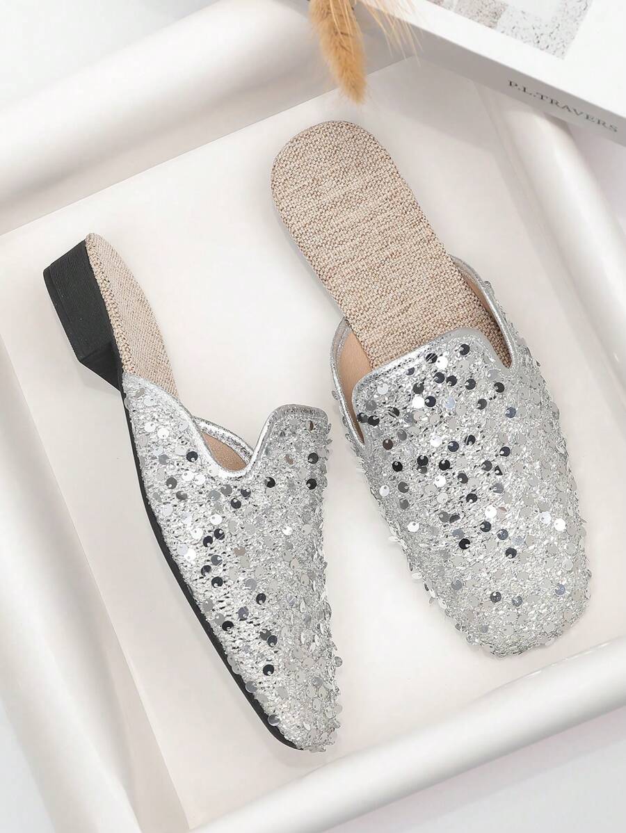 أحذية مولات مسطحة نسائية بإبزيم زخرفي بلون الفضي والذهبي، وأصابع مربعة، وقابلة للارتداء من الخلف، تنفس مغلقة للأصابع، صنادل قابلة للارتداء في الصيف مع الفساتين