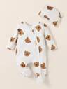 SHEIN مجموعة من قطعتين ملابس رضيع حديث الولادة ولد/بنت، جمبسوت كرتونية مطبوعة الدب مع قبعة، ملابس للجنسين مناسبة للاستخدام اليومي، حفلة عيد الميلاد، التصوير الفوتوغرافي، جميع المواسم