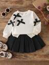 مجموعتان لطفلة رضيعة، ملابس علوية كاجوال برقبة دائرية وأكمام طويلة مزين بفيونكة سوداء، وتنورة ذات طيات